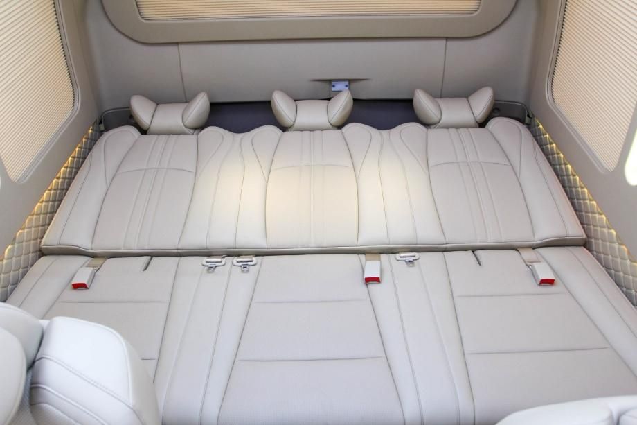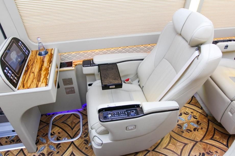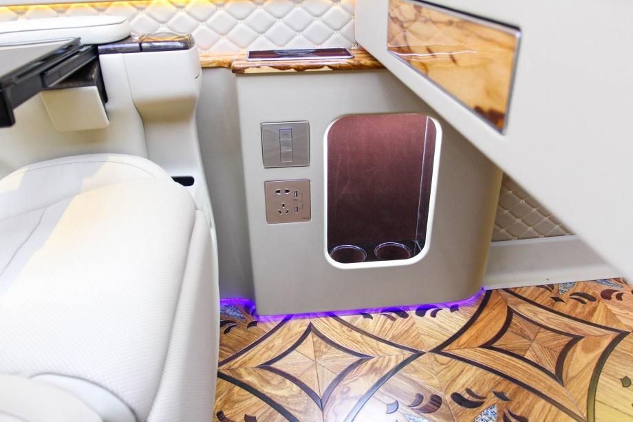 中控台与门板的龙血檀木饰板采用 “嵌入式包边” 设计,与米色 Nappa 真皮内饰形成 “冷硬木纹 + 暖柔皮质” 的碰撞,触摸时能感知木材的天然肌理,告别传统商务车的塑料质感。桌板边缘的龙血檀木经手工倒角处理,无毛刺残留,细节处尽显定制匠心,即便是水杯放置的细微接触,都能传递出高端材质的奢华感。